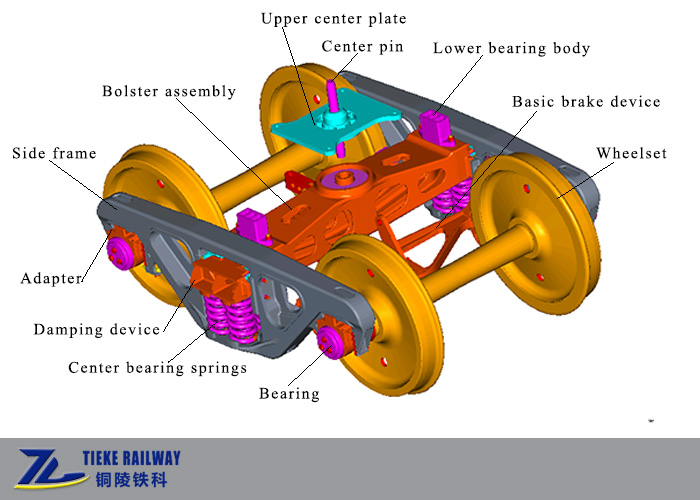 This 1067mm 13T axle load bogie adopts three-big-pieces casting steel structure. It is mainly composed of bolster and side frames, 860mm wheel sets, AAR Class C 5’’X9’’ rolling bearing, adapter, center bearing springs, brake beam assembly, controlled wedge damping device, lower bearing body, center plates and etc.